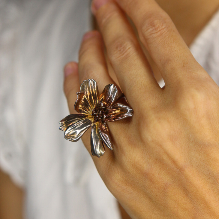 Кольцо с цветком Космеи в серебре и минералах. Основа кольца имеет природную форму, похожую на ветвь. Благодаря нашей невероятной технологии внутри украшения под слоем серебра скрыт настоящий цветок. Украшение легко регулируется самостоятельно, подходит под ваш размер и такие кольца никогда не повторятся. Эти кольца, как и другие наши изделия — это возврат к уникальности. Такое кольцо будет только у вас.